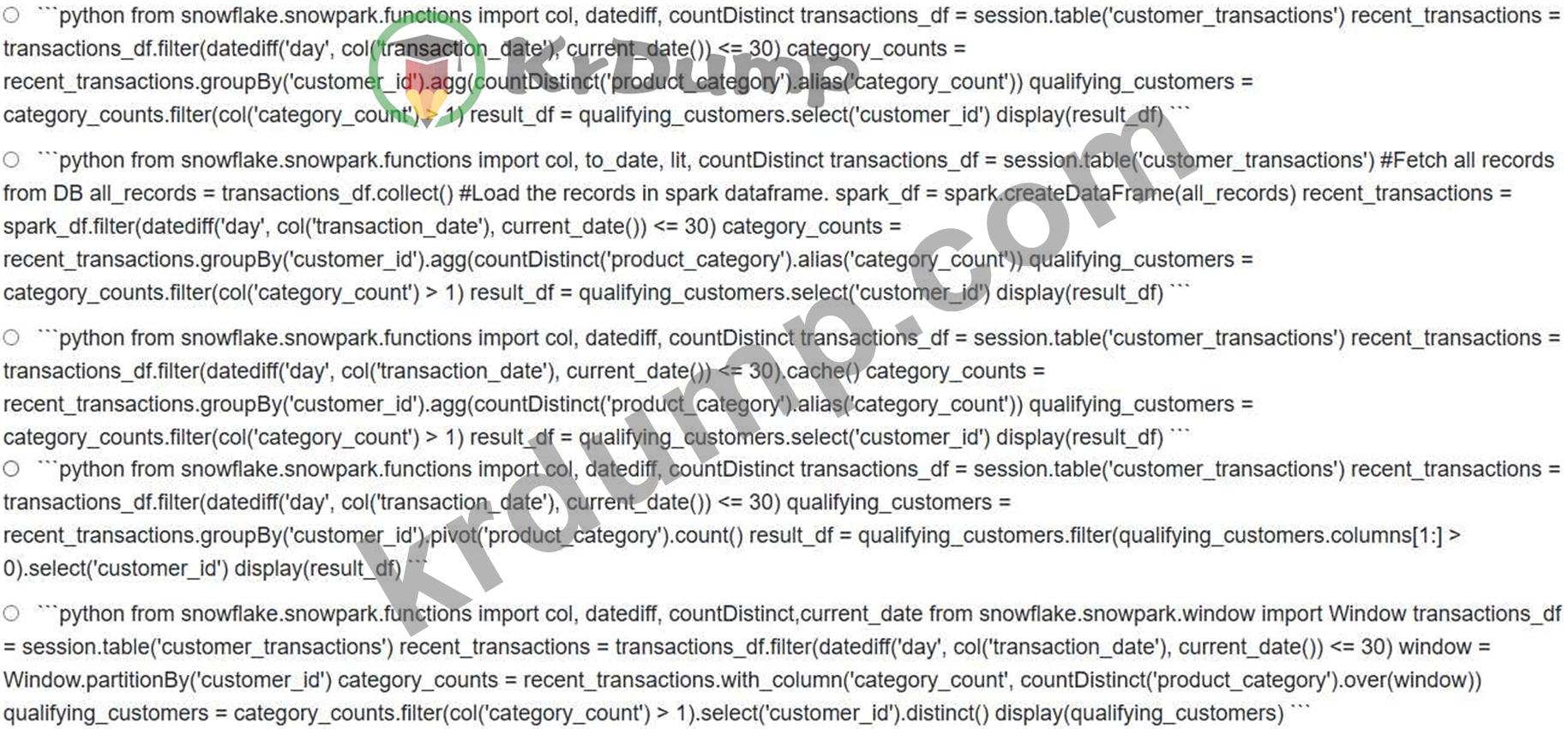 You are using Snowpark Python to perform data transformation on a large dataset stored in a Snowflake table named customer transactions'. This table contains columns such as 'customer id', 'transaction date', 'transaction amount', and product_category'. Your task is to identify customers who have made transactions in more than one product category within the last 30 days. Which of the following Snowpark Python snippets is the most efficient way to achieve this, minimizing data shuffling and maximizing query performance?