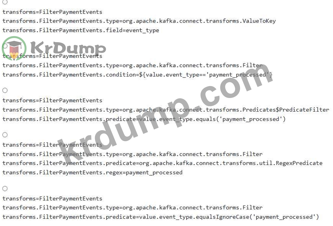 You're configuring a Kafka connector to load data into Snowflake. You need to ensure that only records with a specific 'event_type' field equal to 'payment_processed' are loaded into the 'PAYMENT TABLE in Snowflake. Given the following connector configuration snippet, which additional property must be added to the 'transforms' section to achieve this filtering?