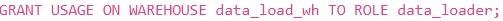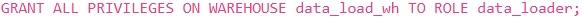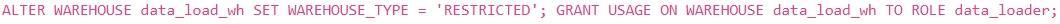 Snowflake 관리자가 데이터 로딩에 사용되는 특정 가상 웨어하우스에 '데이터 로더' 역할을 가진 사용자만 접근할 수 있도록 설정하려고 합니다. 다음 SQL 명령 중 권한이 없는 사용자가 웨어하우스를 사용하는 것을 방지하여 이를 달성하는 가장 안전하고 효과적인 방법은 무엇입니까?