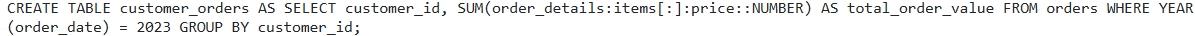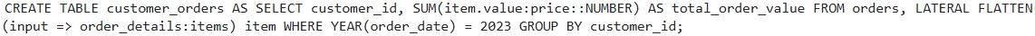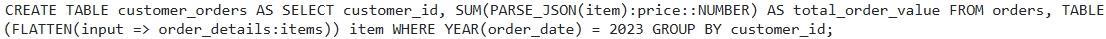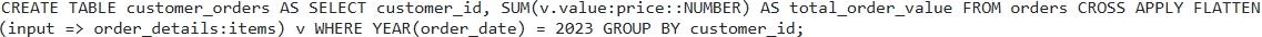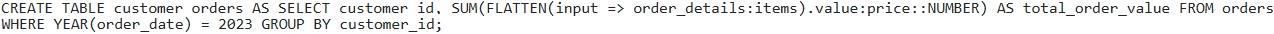 데이터웨어하우스에 'orders' 테이블이 있고, 이 테이블에는 'order_id', 'customer_id', 'order_date', 'order_details' 열이 있습니다(중첩된 JSON을 포함하는 VARIANT 유형). 새 테이블을 만들어야 합니다.