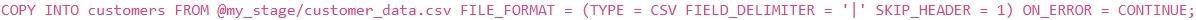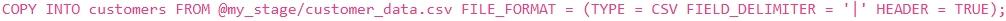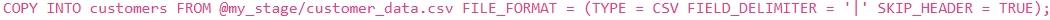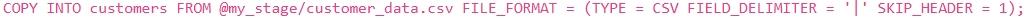 'email'입니다. 파일은 파이프로 구분되어 있으며 첫 번째 행에 헤더가 포함되어 있습니다. 이 데이터를 기존 테이블인 'customers'에 로드하려고 합니다. 'customers' 테이블에는 이미 열이 올바르게 정의되어 있으며, 로드하는 동안 헤더 행을 건너뛰고 싶습니다. 이 작업을 수행하는 가장 효율적이고 올바른 'COPY INTO' 명령문은 무엇입니까?