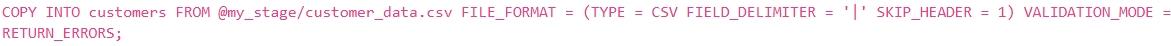 `my_stage'. CSV 파일에는 , 'first_name', 'last_name' 및 열이 있는 고객 데이터가 포함되어 있습니다.