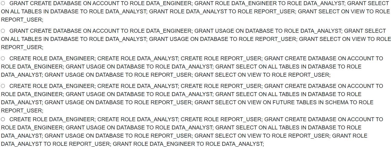 보안 설계자는 Snowflake에서 데이터 분석 팀을 위한 역할 계층을 설계하고 있습니다. 각 사용자 그룹에 특정 권한을 부여해야 합니다. '데이터 엔지니어' 역할은 데이터베이스를 생성하고 관리할 수 있어야 합니다. '데이터 분석가' 역할은 해당 데이터베이스에서 데이터를 쿼리할 수 있어야 합니다. '보고서 사용자' 역할은 특정 뷰에 대한 읽기 전용 액세스 권한이 필요합니다. 설계자는 최소한의 권한을 보장하고 역할 분리를 강화하려고 합니다. 다음 SQL 명령 시퀀스 중 이 역할 계층을 올바르게 설정하고 필요한 권한을 부여하는 것은 무엇입니까?