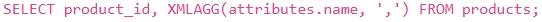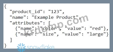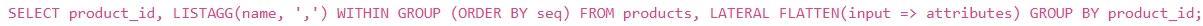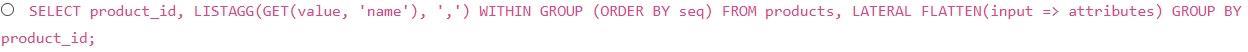 각 제품에 대해 `attributes` 배열에서 `name` 속성을 모두 쉼표로 구분된 단일 문자열로 추출해야 합니다. 다음 중 어떤 Snowflake SQL 문을 사용하면 이 작업을 수행할 수 있습니까?