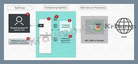 이 문제는 제공된 다이어그램에서 번호가 매겨진 구성 요소(1, 2, 3, 4)의 구성 요소 유형을 식별해야 합니다. 이 다이어그램은 아키텍처 유형 A4(사용자 환경)와 아키텍처 유형 A1(그룹 허브)의 Swift 인프라를 보여줍니다. 이 분류는 Swift 고객 보안 제어 프레임워크(CSCF) v2024 및 관련 아키텍처 정의를 기반으로 합니다.