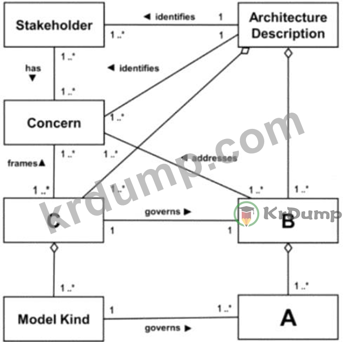 (A diagram showing relationships betweenStakeholder, Concern, Architecture Description, Model Kind, and elements A & B.) Which answer correctly identifiesAandB?
