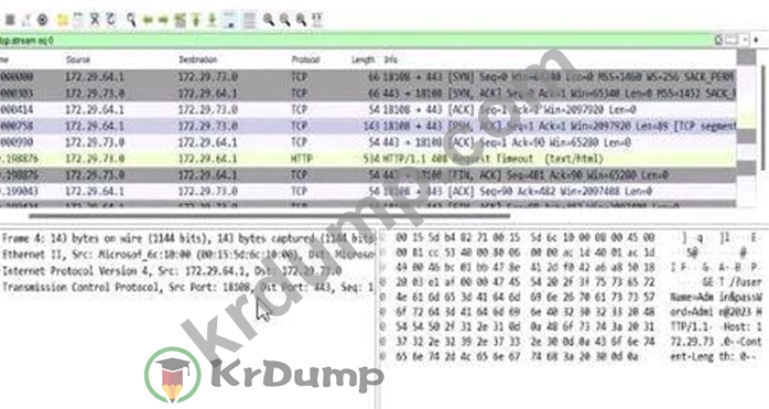이 스크린샷은 네트워크 프로토콜 분석기인 Wireshark에서 캡처된 네트워크 트래픽을 보여줍니다. 관련 열에는 소스 및 목적지 IP 주소, 포트, 프로토콜, 그리고 패킷에 대한 추가 정보가 포함됩니다. 세부 정보를 자세히 살펴보겠습니다. 목적지 포트 분석: 스크린샷에는 목적지 포트가 443인 여러 패킷이 표시됩니다(예: "목적지" 열에 "172.72.61.9:443"과 같은 항목이 있음). 포트 443은 SSL/TLS를 사용하여 암호화된 HTTP 트래픽인 HTTPS(HTTP 보안)의 기본 포트입니다. 이는 애플리케이션이 HTTPS를 통해 통신하고 있음을 나타냅니다. 프로토콜 분석: "프로토콜" 열에는 대부분의 패킷(예: 프레임 번호 2000084, 2000086)에 대해 "TLSv1.2"가 표시됩니다. TLS(전송 계층 보안)는 HTTPS에서 HTTP 통신 보안을 위해 사용하는 암호화 프로토콜입니다. 이는 트래픽이 일반 HTTP가 아닌 HTTPS임을 확인합니다. 패킷 세부 정보: "정보" 열은 TLS 패킷의 경우 "애플리케이션 데이터"와 같은 추가적인 정보를 제공하며, 이는 암호화된 애플리케이션 계층 데이터(HTTPS의 전형적인 특징)를 나타냅니다. HTTP 패킷(예: 프레임 2000088)도 있지만, 이는 HTTPS 세션(예: "HTTP2"로 표시된 TLS를 통한 HTTP/2)의 일부일 가능성이 높습니다. 이제 옵션을 평가해 보겠습니다. 옵션 A: "애플리케이션이 포트 443과 HTTPS 프로토콜에서 실행 중입니다." 맞습니다. 대상 포트 443과 TLSv1.2 사용은 애플리케이션이 HTTPS를 사용하고 있음을 확인합니다. HTTPS는 보안 웹 통신을 위한 표준 프로토콜이며, 포트 443은 HTTPS의 지정 포트입니다. CNSP 문서에서는 포트 443의 HTTPS 트래픽이 민감한 데이터를 처리하는 웹 애플리케이션에 자주 사용되는 보안 애플리케이션 계층 프로토콜임을 강조합니다. 옵션 B: "HTTP 프로토콜을 통해 사용자 인증 정보가 제출되었습니다." 이는 잘못된 설명입니다. HTTP는 일반적으로 포트 80을 사용하지만, 스크린샷에서는 TLS를 사용하는 포트 443의 트래픽이 HTTPS를 통해 전송됨을 보여줍니다. 이 연결을 통해 제출된 사용자 인증 정보는 HTTP를 통해 일반 텍스트로 전송되는 것이 아니라 HTTPS를 통해 암호화됩니다. CNSP는 암호화 부족으로 인해 HTTP 사용자 인증 정보 제출 시 보안 위험이 있다고 강조하지만, 이 경우에는 그렇지 않습니다. 옵션 C: "자격 증명이 HTTPS 프로토콜을 통해 제출되었습니다." 이 문장은 사실일 수 있지만(HTTPS가 사용 중이므로 모든 자격 증명이 안전하게 제출될 가능성이 높음), 질문은 스크린샷을 기반으로 "올바른" 문장을 요구합니다. 스크린샷에는 자격 증명 제출(예: 폼 데이터가 포함된 POST 요청)이 명시적으로 표시되지 않고 프로토콜과 포트만 표시됩니다. 옵션 A는 자격 증명 제출이라는 구체적인 동작이 아닌 애플리케이션의 프로토콜과 포트에 초점을 맞추므로 스크린샷에서 더 직접적으로 뒷받침됩니다. CNSP는 HTTPS가 기밀성을 보장한다고 언급하지만, 이 옵션은 자격 증명에 대한 더 구체적인 증거가 필요합니다. 옵션 D: "애플리케이션이 포트 80과 HTTP 프로토콜에서 실행 중입니다." 이는 잘못된 설명입니다. HTTP의 기본 포트는 포트 80이지만, 스크린샷에는 포트 443과 TLS가 명확하게 표시되어 HTTPS를 나타냅니다. CNSP 문서에서는 HTTP(포트 80, 암호화되지 않음)와 HTTPS(포트 443, 암호화됨)를 구분하여 설명하고 있으므로 이 옵션은 유효하지 않습니다. 결론: 스크린샷에서 직접적으로 뒷받침되는 가장 정확하고 포괄적인 진술은 옵션 A이며, 애플리케이션이 포트 443과 HTTPS를 사용함을 확인합니다. 옵션 C는 더 넓은 맥락에서는 사실일 수 있지만, 캡처된 패킷에서 자격 증명 제출에 대한 명확한 증거가 없다면 덜 확실합니다.