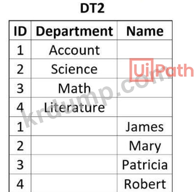 프로세스를 개발할 때 아래와 같이 "DT1"과 "DT2"라는 두 개의 데이터 테이블이 제공되었습니다.