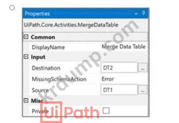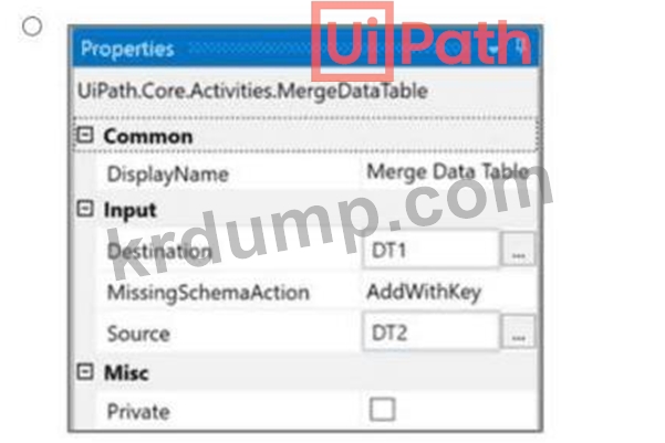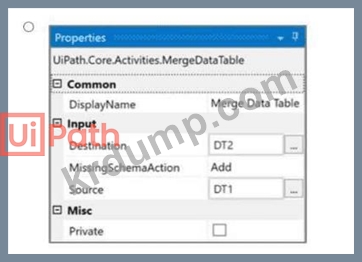 프로세스를 개발할 때 아래와 같이 "DT1"과 "DT2"라는 두 개의 데이터 테이블이 제공되었습니다.