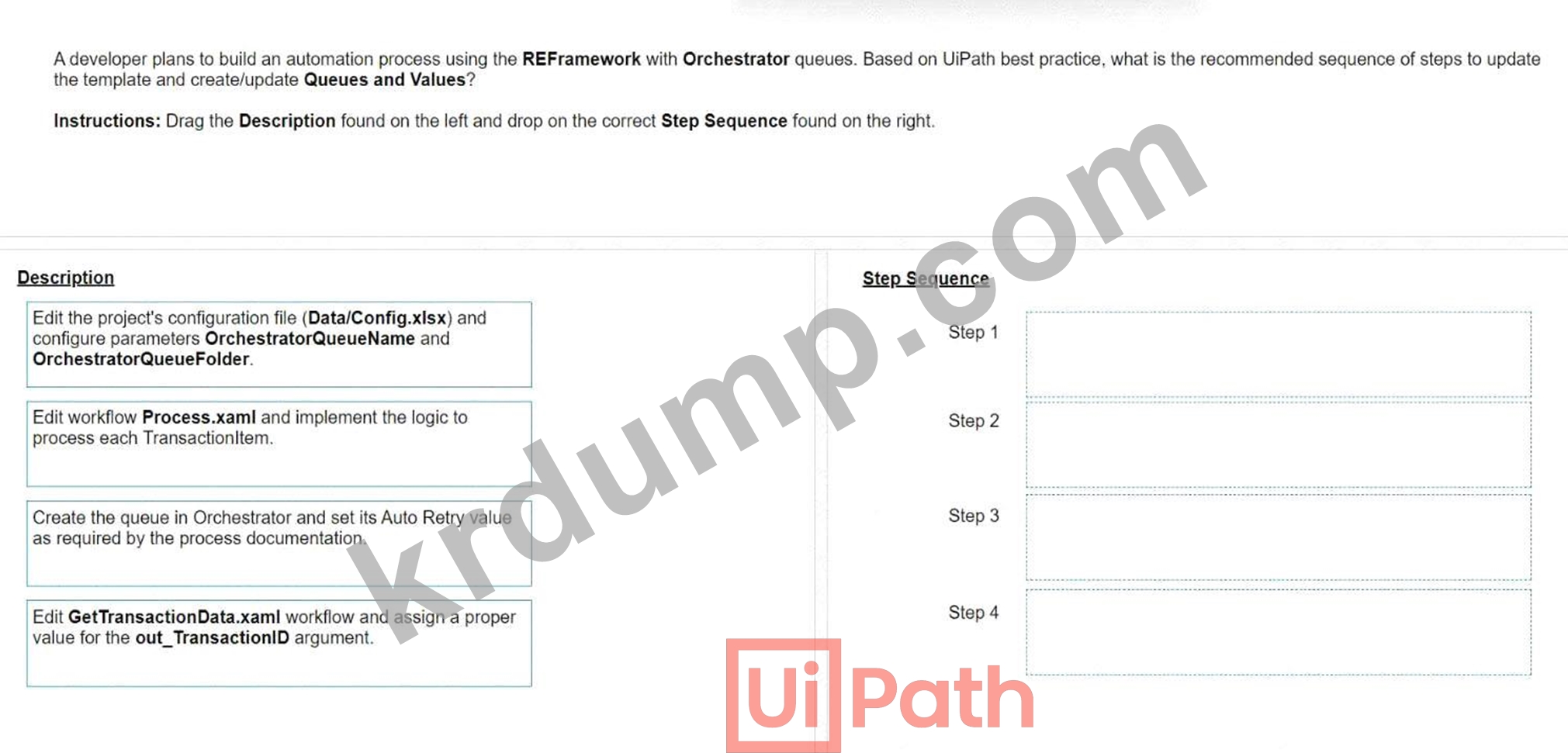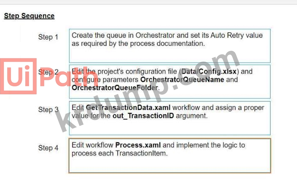 개발자는 REFramework를 사용하여 Excel 테이블 내의 트랜잭션을 처리하는 비즈니스 프로세스를 자동화해야 합니다. 테이블의 각 트랜잭션은 동일한 처리 단계를 따라야 하며, 환경에 Orchestrator가 없으므로 대기열을 사용할 수 없습니다.