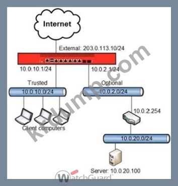 신뢰할 수 있는 네트워크의 클라이언트는 선택적 네트워크의 라우터 뒤에 있는 서버에 연결해야 합니다. 이 이미지를 기반으로 신뢰할 수 있는 네트워크의 클라이언트에서 10.0.20.100의 서버에 도달하는 트래픽에 대해 Firebox에 어떤 정적 경로를 추가해야 합니까? (하나를 고르세요.)